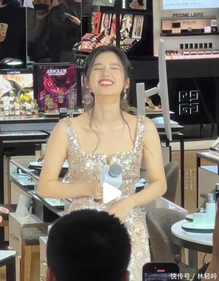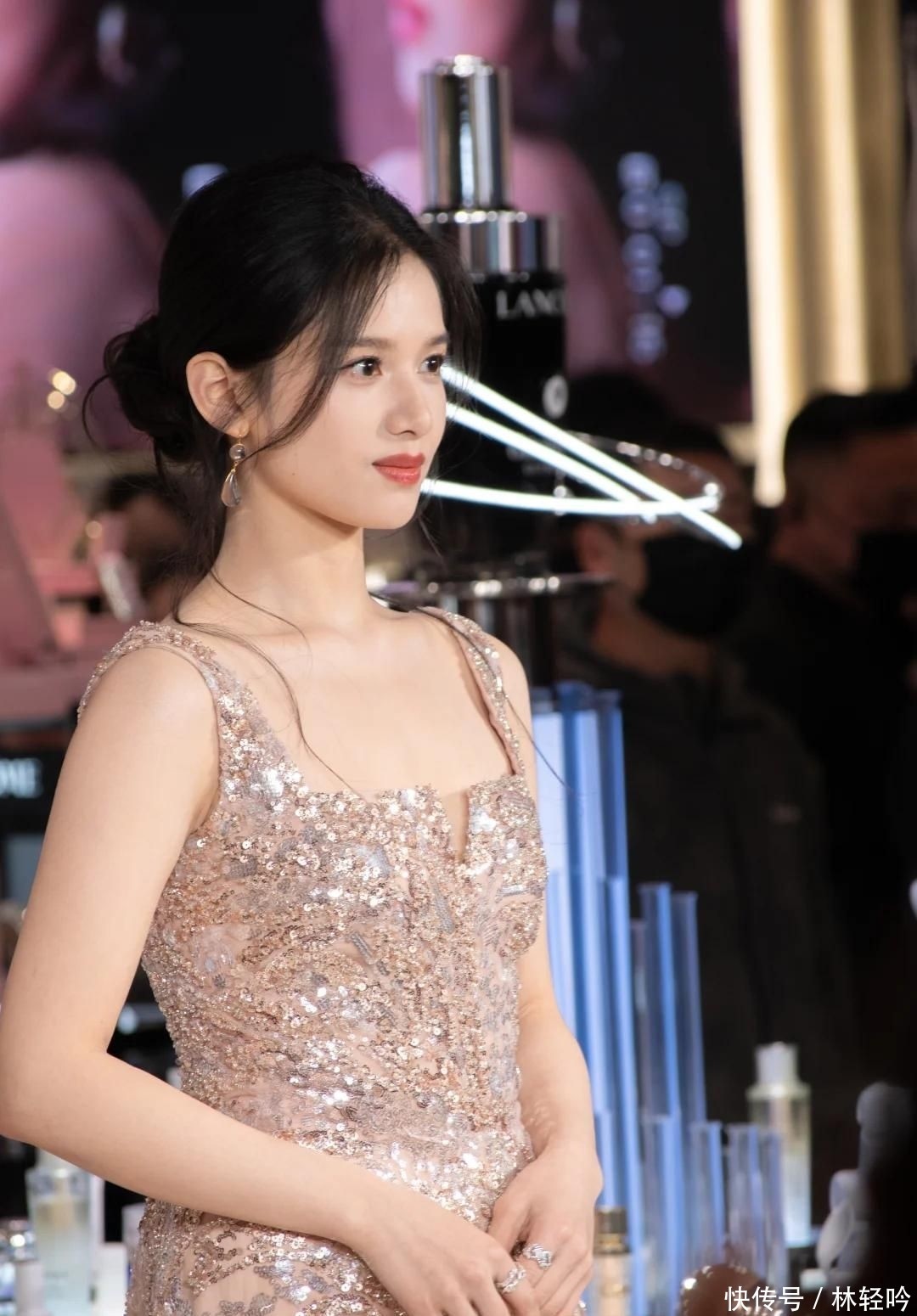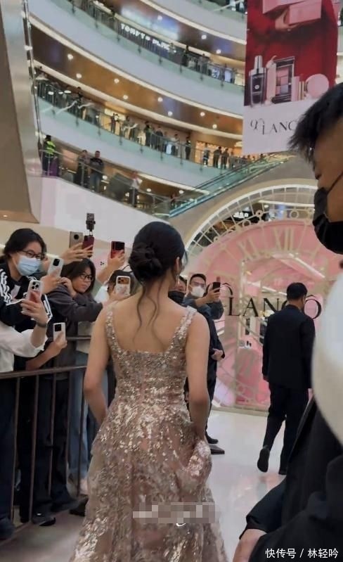 当天她身穿一袭银色吊带长裙,乌发高高盘起,整体造型简约却不失高级感。行走间姿态轻盈灵动,还不时探头向人群挥手致意,神情俏皮可爱,极具亲和力。
