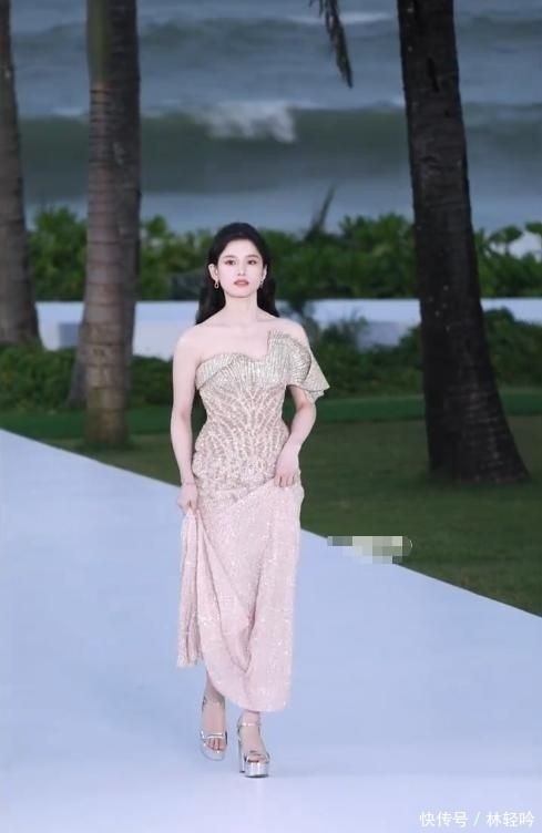 另一次海边主题红毯中,她身着金色拖尾长裙,脚踩银色粗跟高跟鞋,整体装扮尽显贵气优雅。