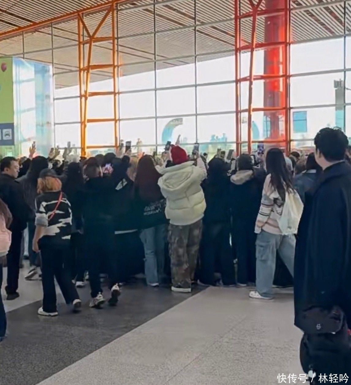 只见上百名粉丝手持手机蜂拥而至,将通道围得密不透风,争先恐后往前推挤,全然不顾公共秩序与人身安全。
