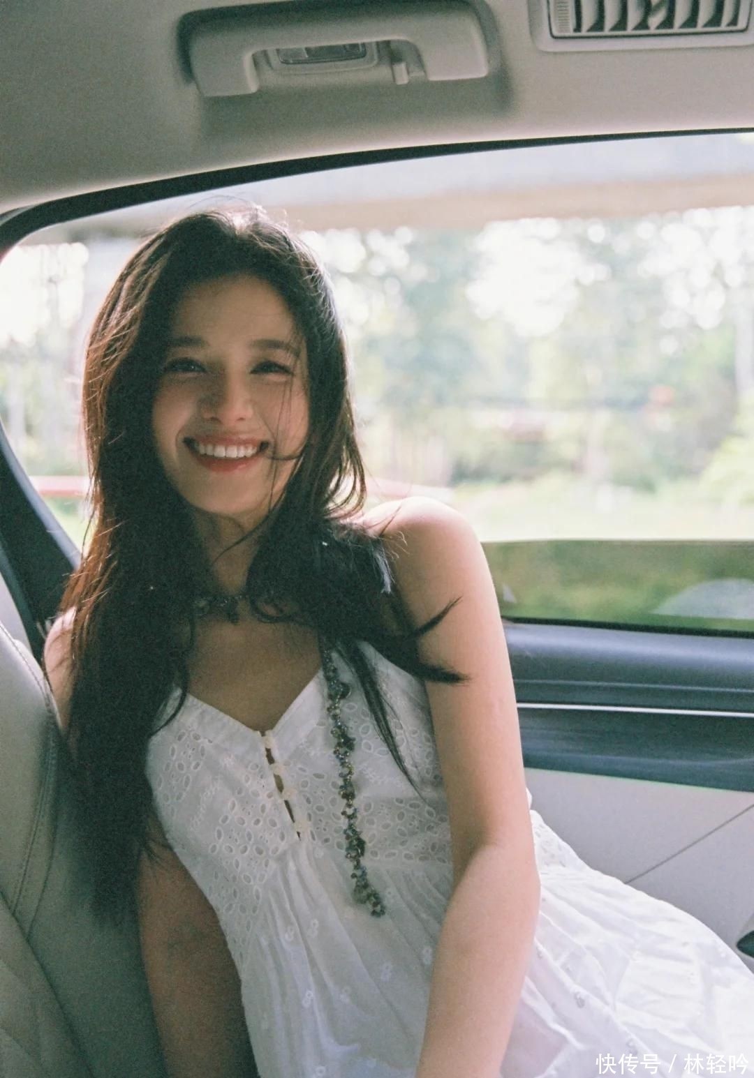 照片中的她披散着柔顺长发,身穿素雅白裙,笑容纯净甜美,宛如初恋般清新动人,堪称“白月光”本尊。